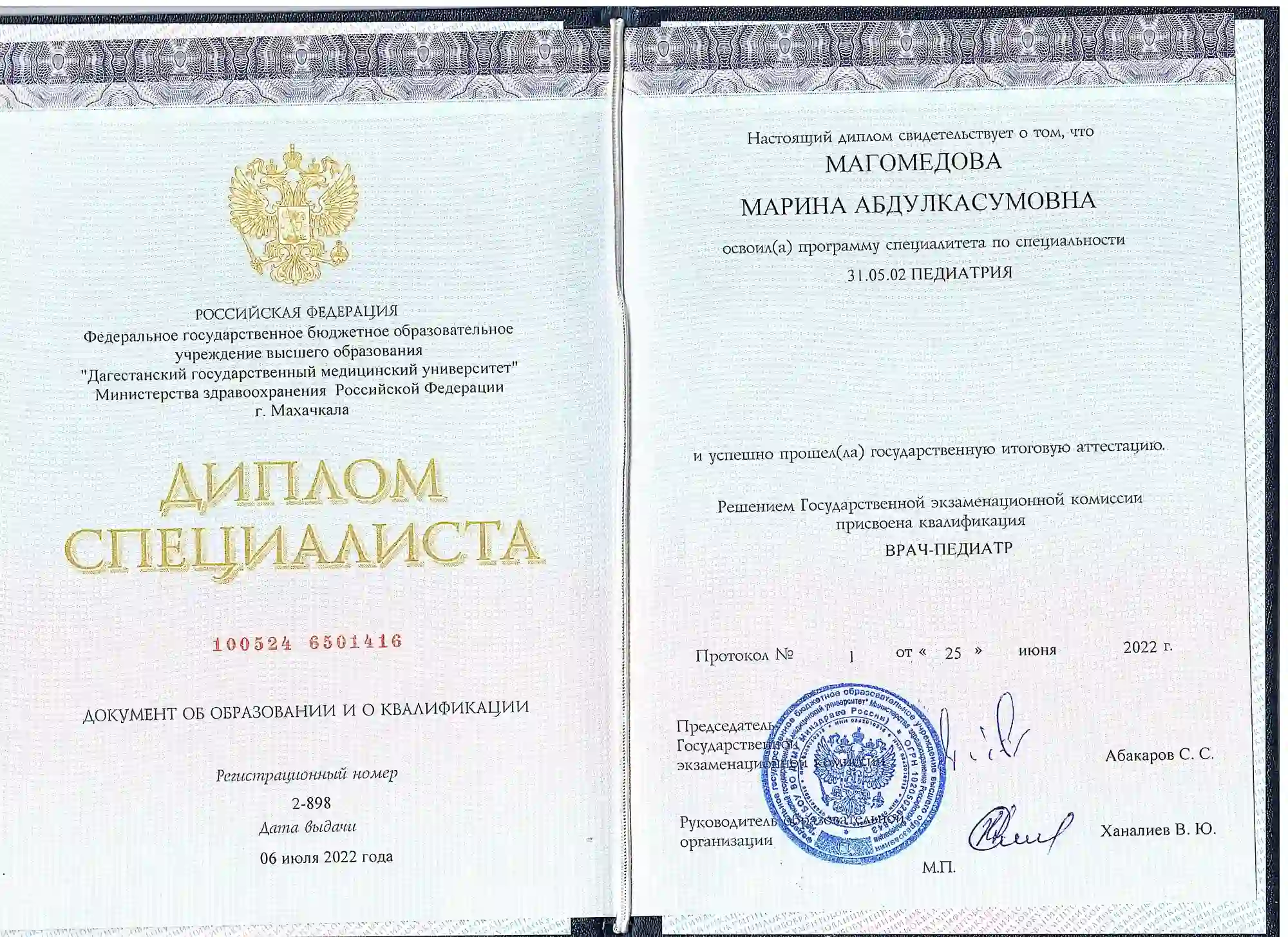 • 2022 — Дагестанский государственный медицинский университет (Врач-педиатр по специальности "Педиатрия");