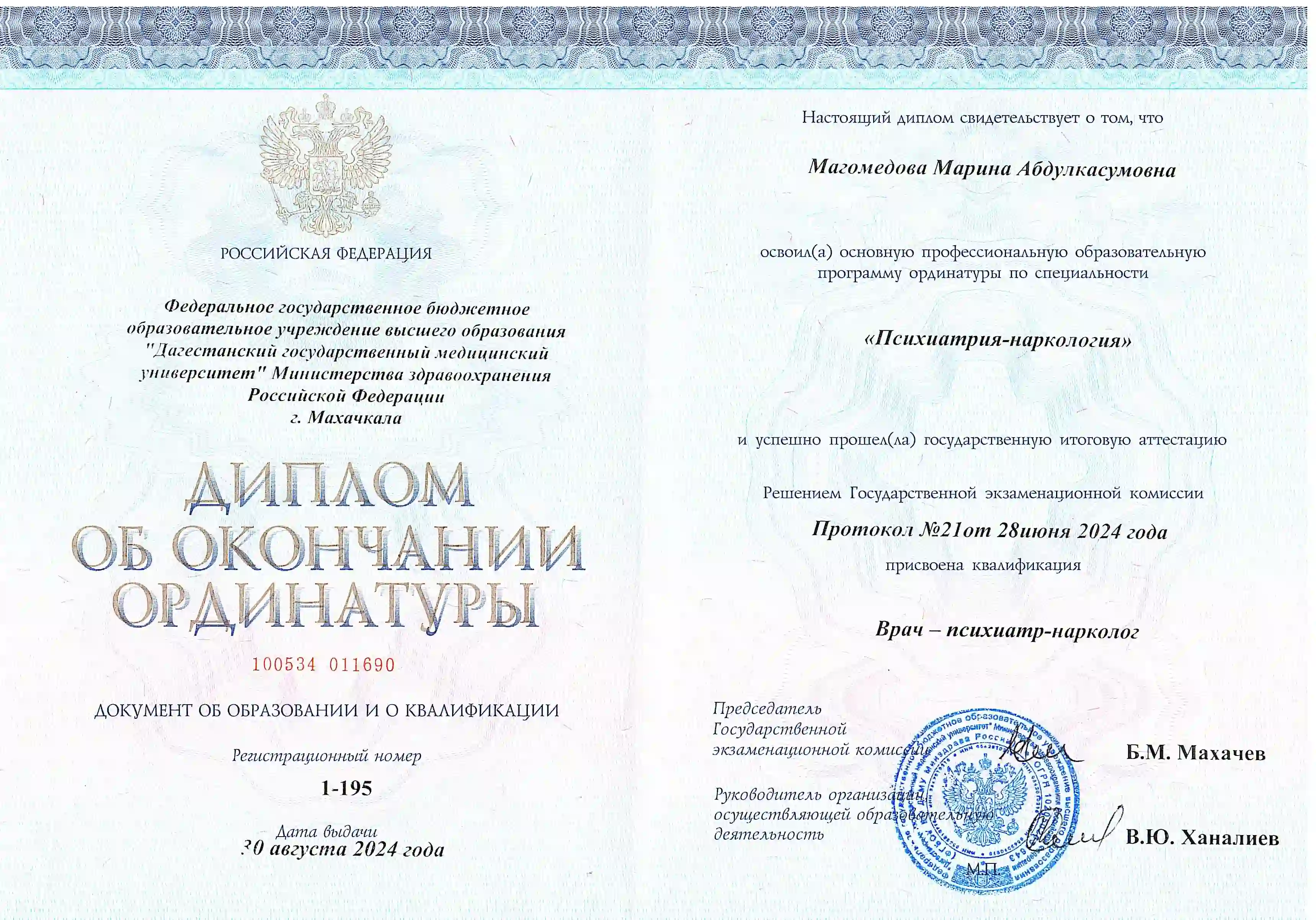 • 2024 — Дагестанский государственный медицинский университет (Врач-психиатр-нарколог по специальности "Психиатрия-наркология");